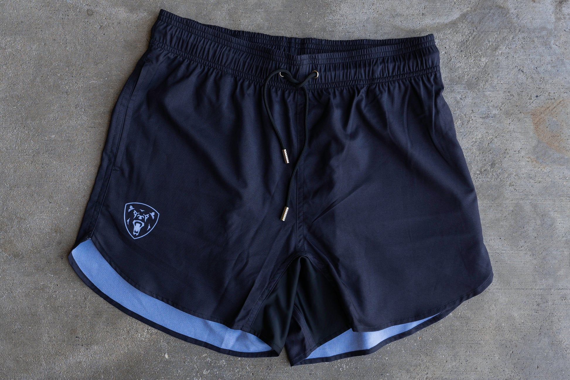 Training shorts that feature two pockets with drainage eyelets, sublimated logo, metal tipped tassels, and a Lycra crotch gusset enables the wearer maximum mobility.