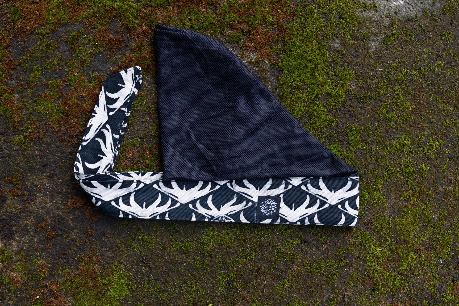 Teratai Suci stamp with the Dodecahedron stamp and a Merkaba woven label. Black mesh head cover.