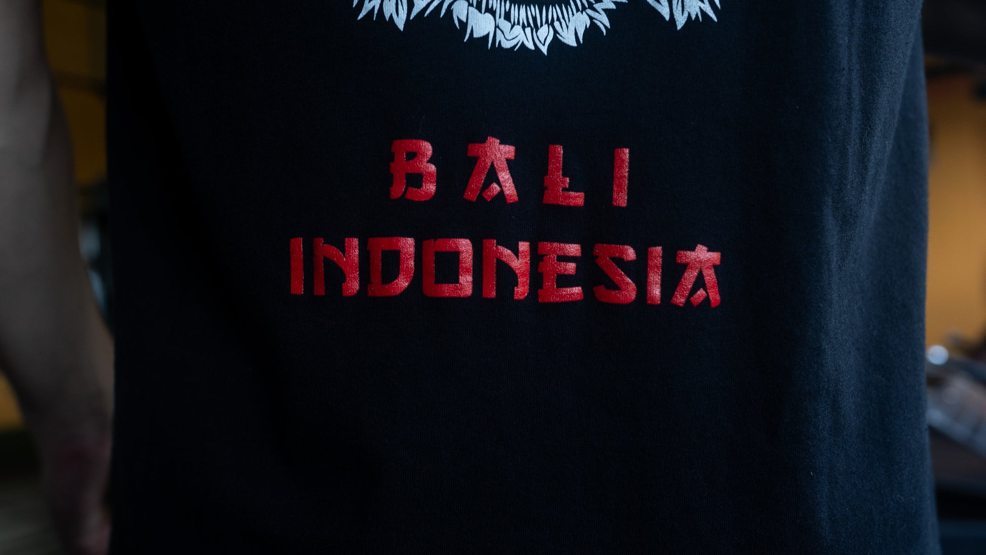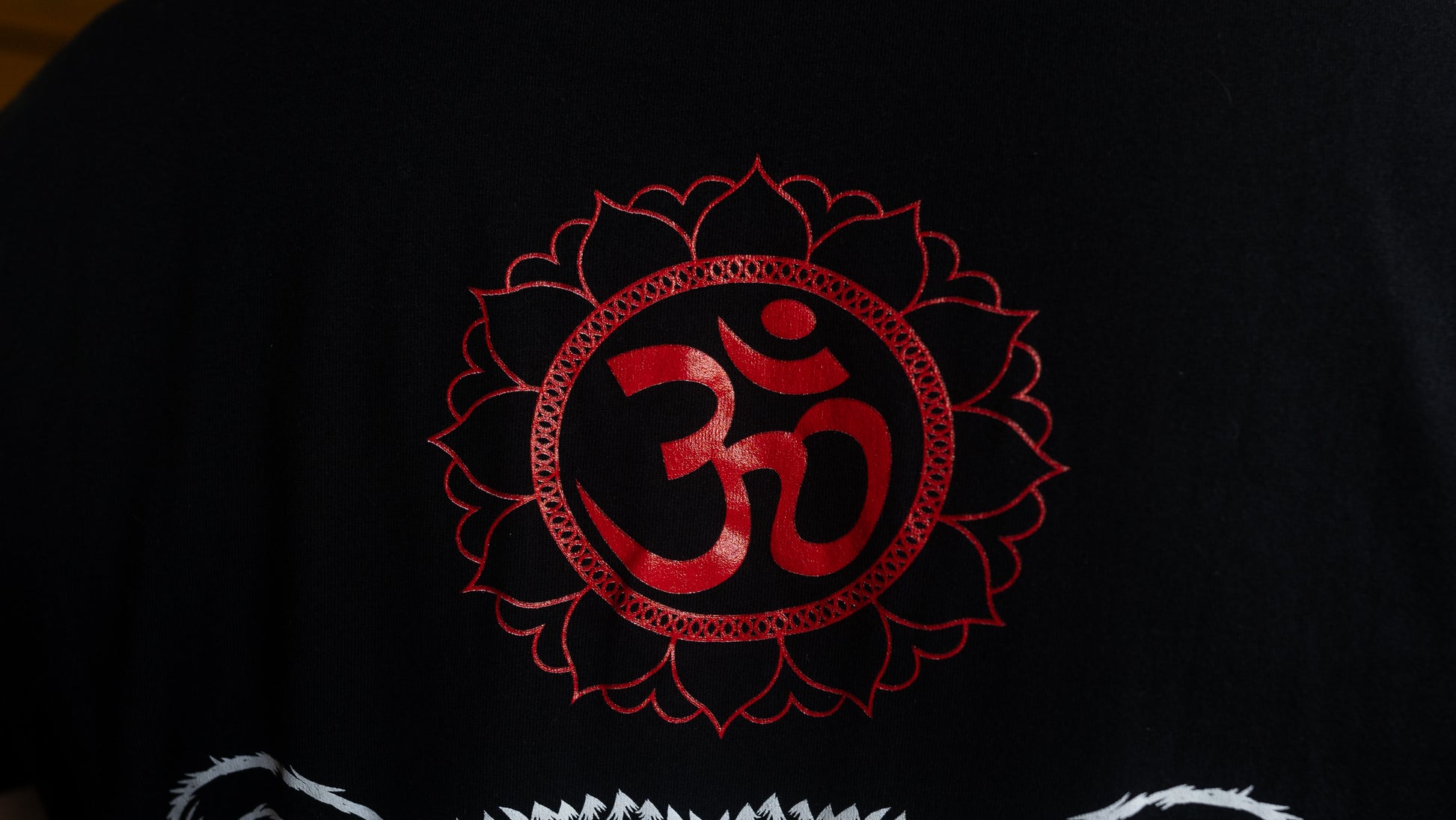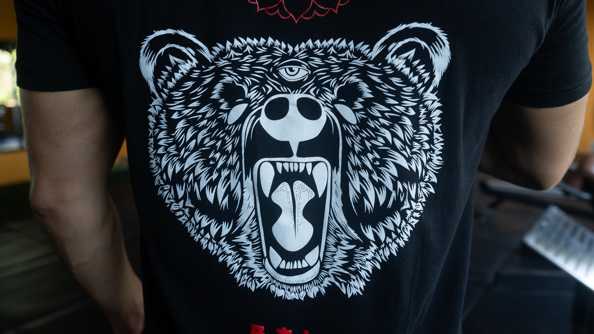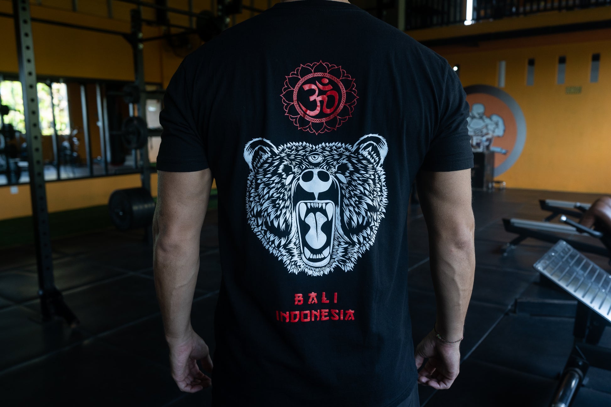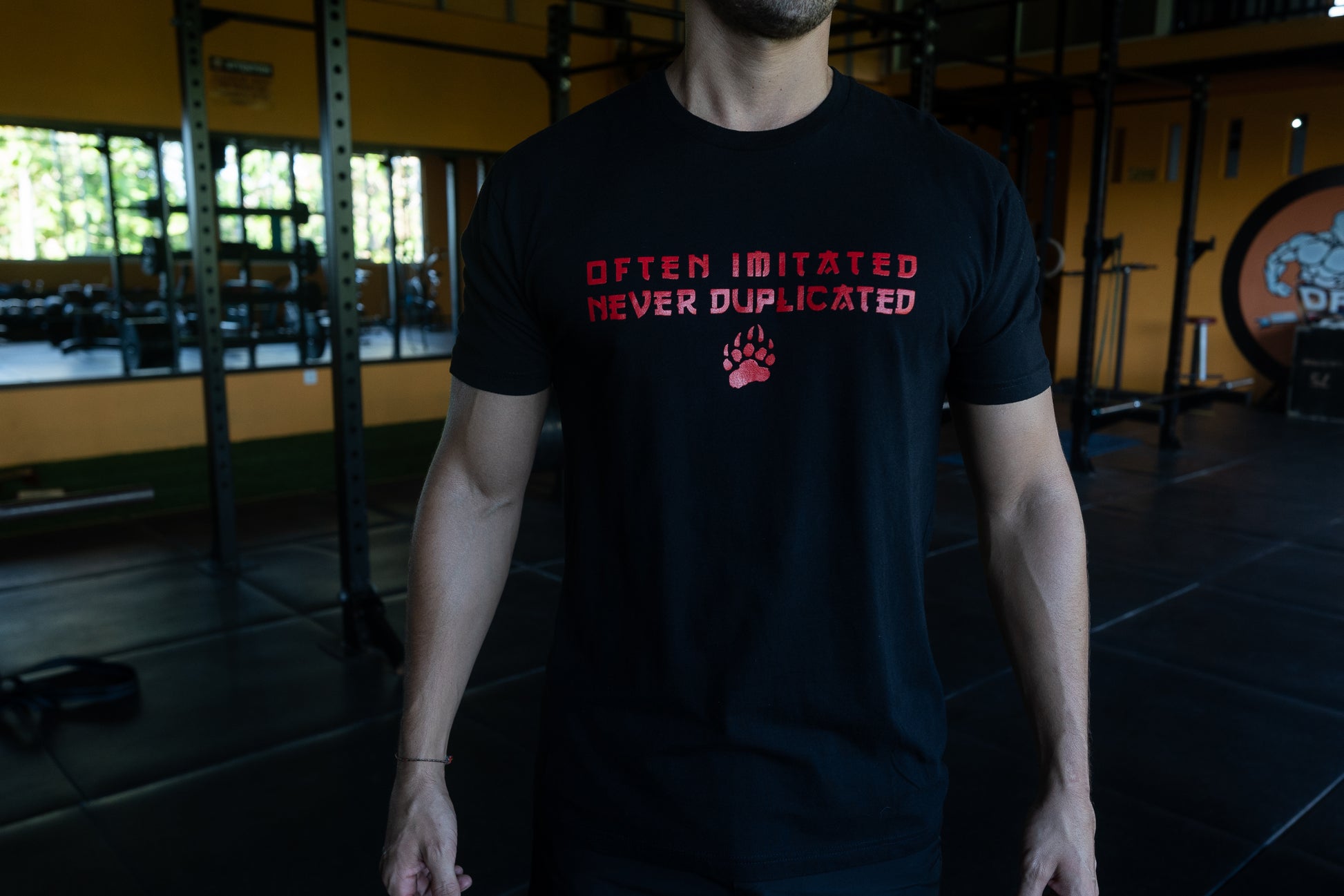 A black unisex 60/40 blend tee shirt with a red front design and red and white back design, featuring a modern fit, crew neck and short sleeves.
