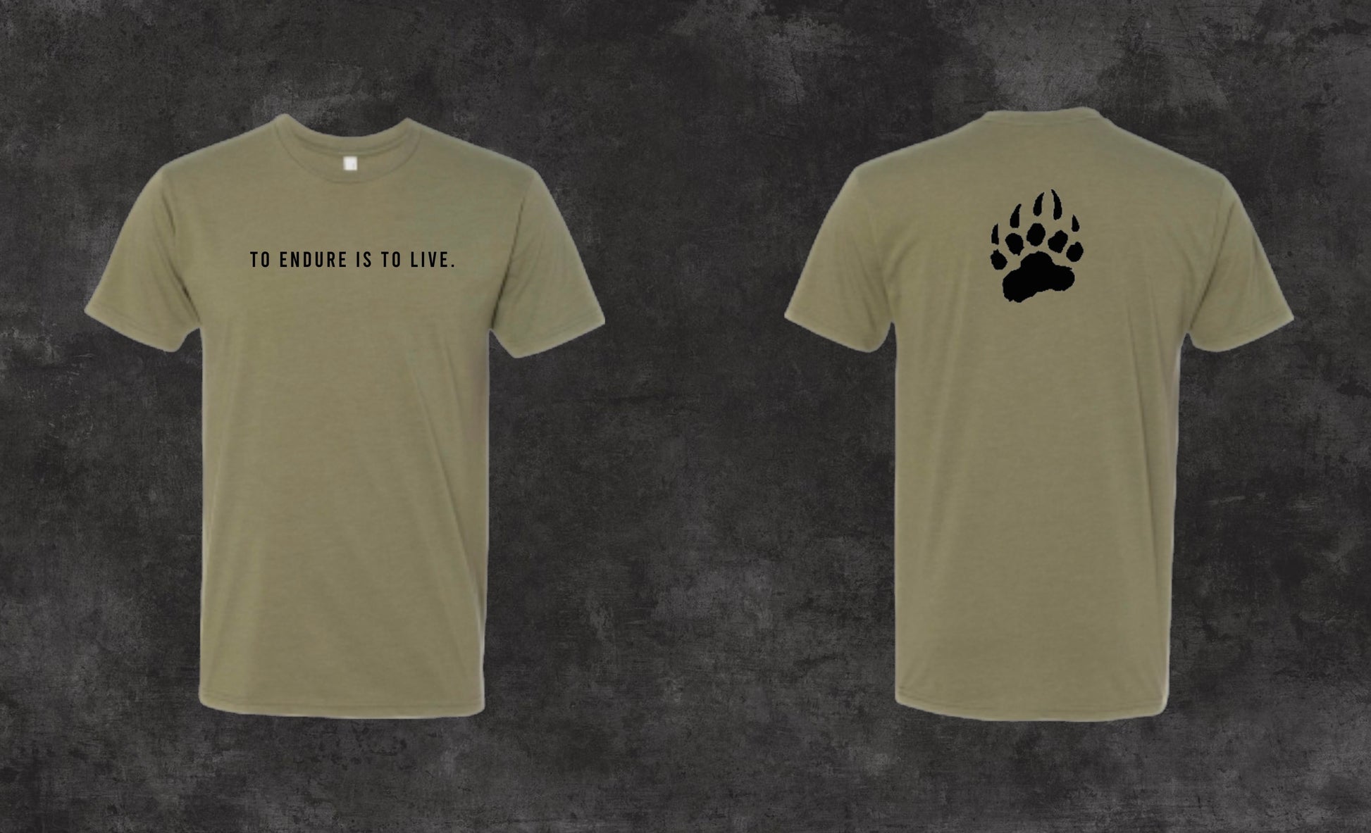 A olive drab triblend tee with the “To Endure Is To Live.” saying on the front and paw design on the back in black print, featuring a uniquely soft triblend fabrication, modern fit, crew neck and short sleeves.