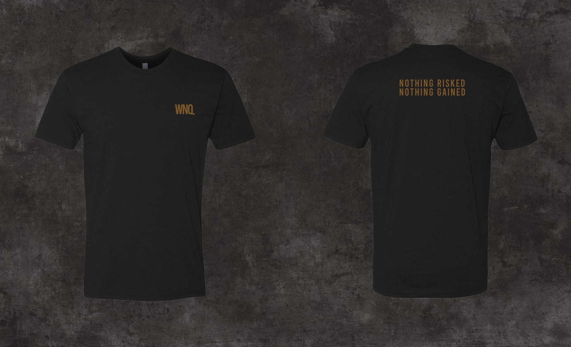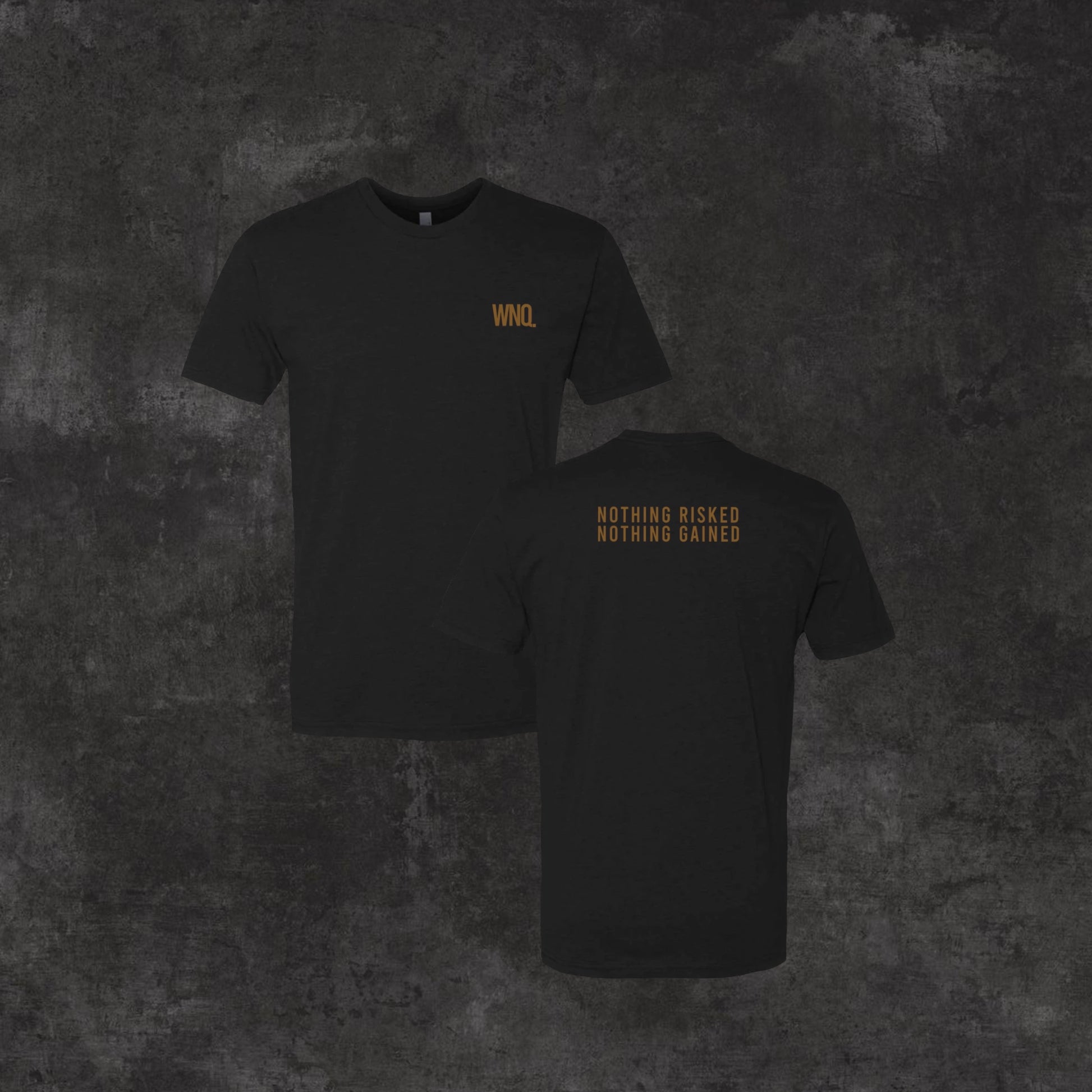 A vintage black triblend tee with the “Nothing Risked, Nothing Gained” saying on the back and WNQ (Winners Never Quit) design on the front in burnt gold print, featuring a uniquely soft triblend fabrication, modern fit, crew neck and short sleeves.
