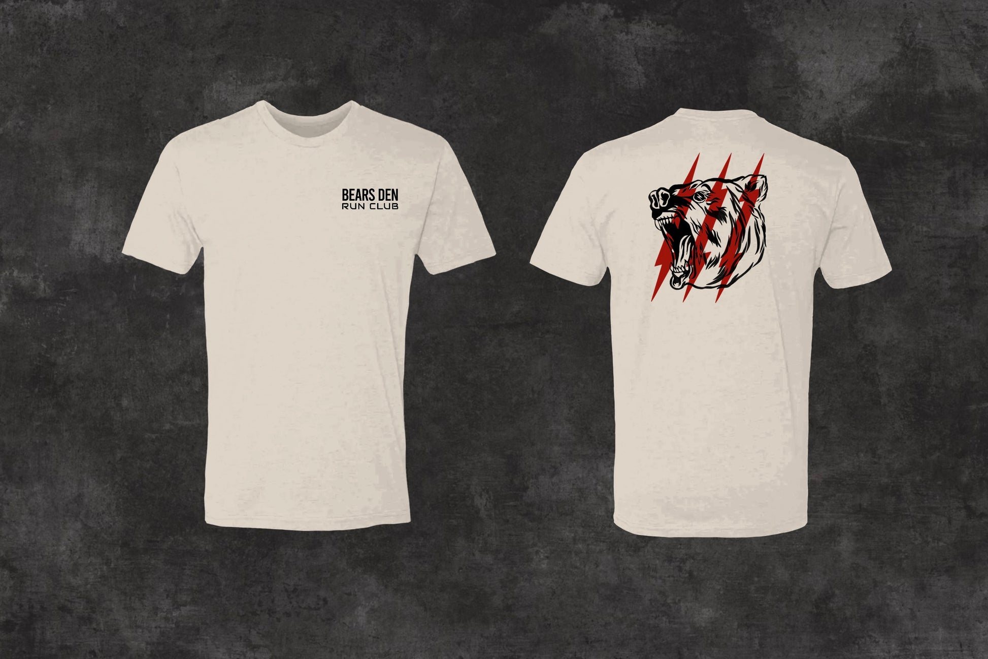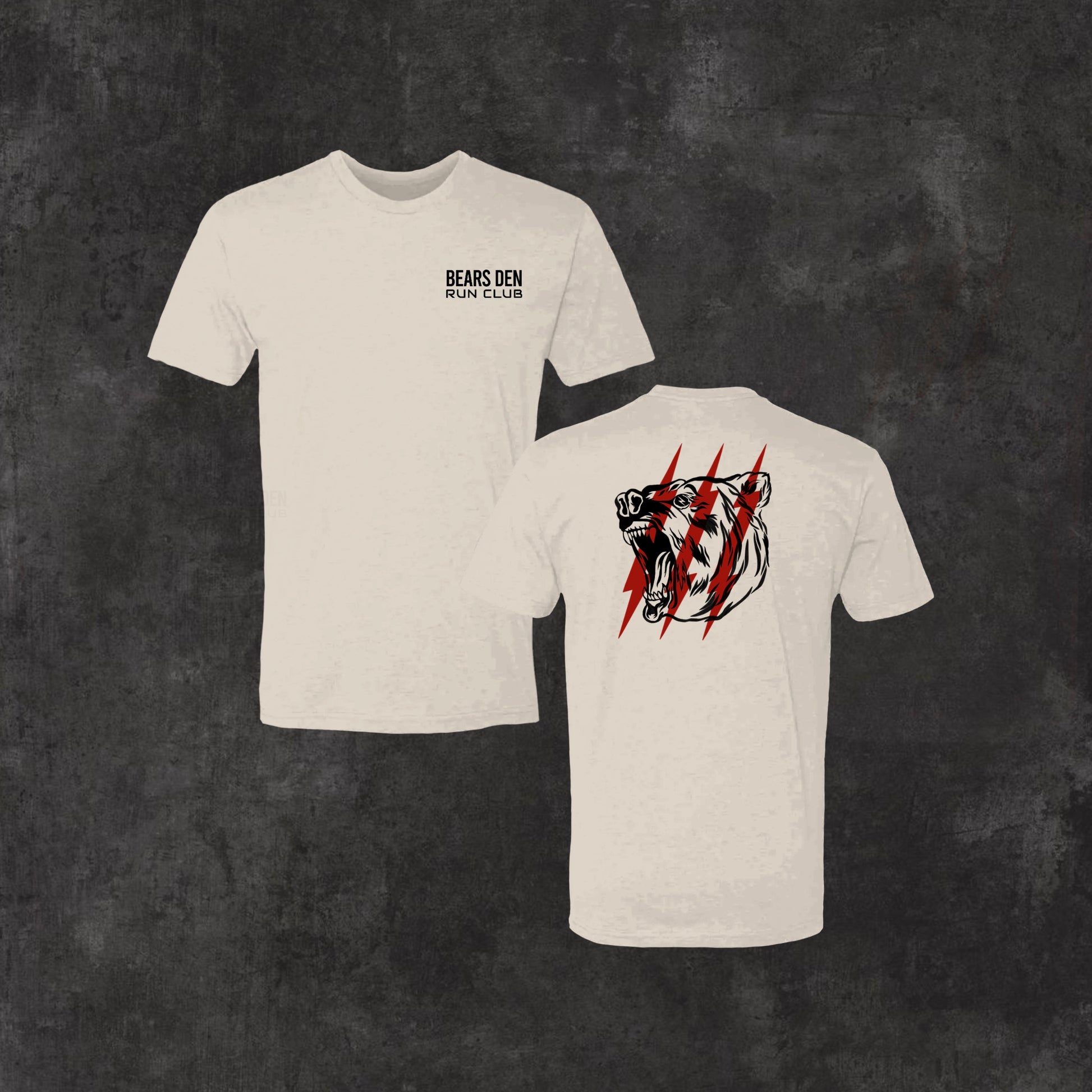 An oatmeal tee with a Bolt Bear design on the back and Bears Den Collective Run Club design on the upper left pec featuring a uniquely soft triblend fabrication, modern fit, crew neck and short sleeves.