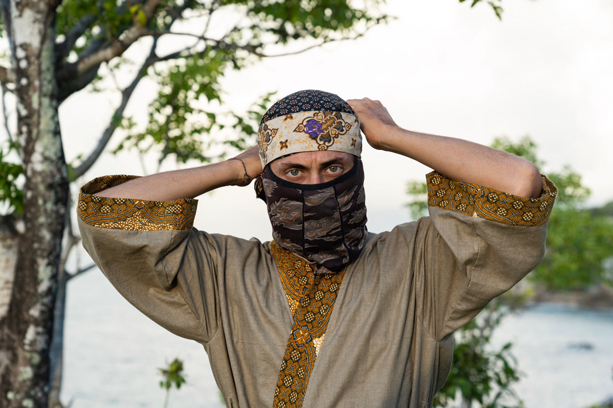 This kimono set is made from linen naturally dyed with mango leaf and a rare Batik Tulis(hand drawn) tan/gold sarong used as the chassis inlay and for the cuff finishing for the top and bottom.