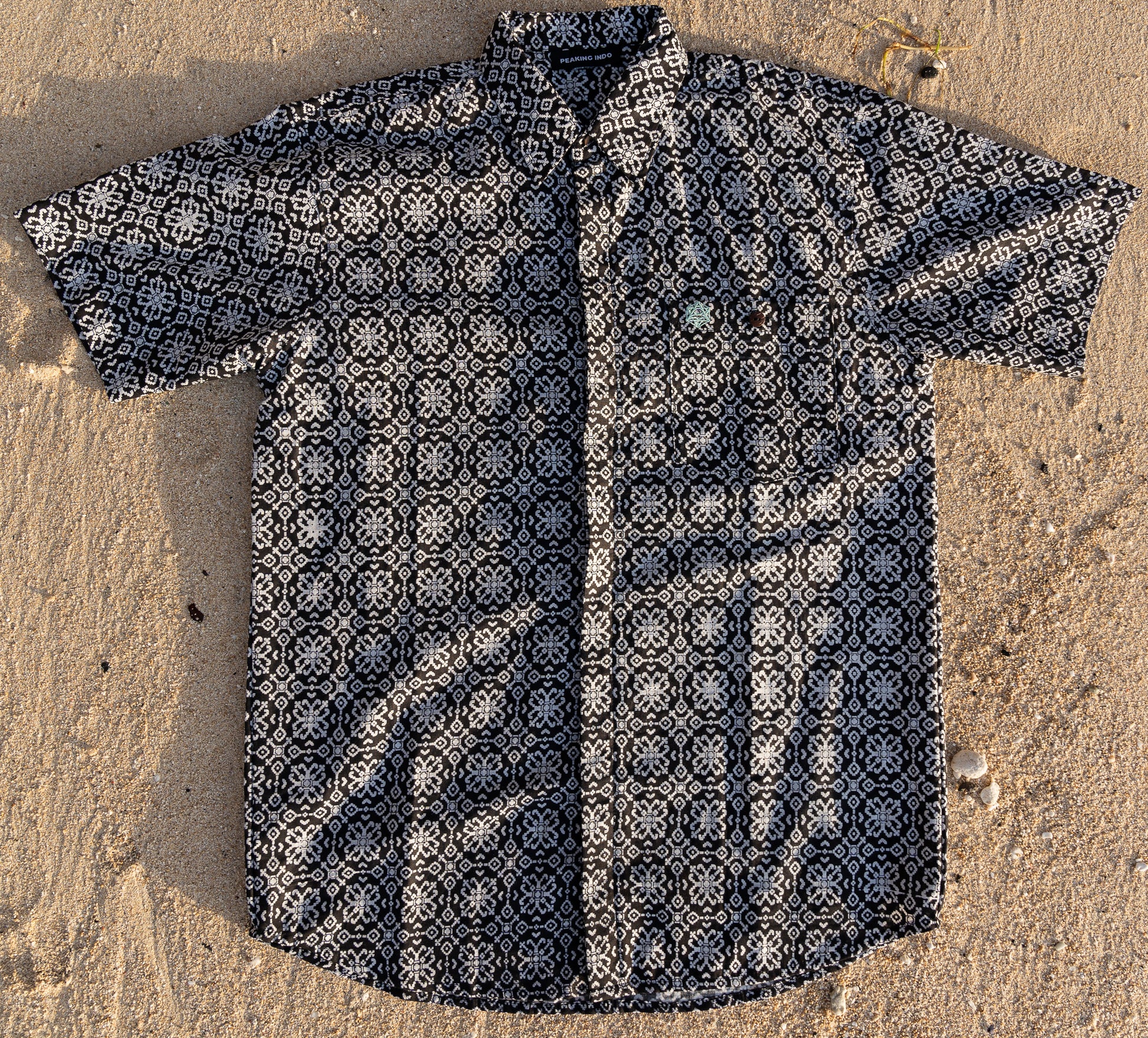 Each cotton shirt is a unique piece that has been hand sewn by our Balinese seamstress and includes a Peaking Indo neck label, Dodecahedron logo embroidery, a chest pocket and coconut shell buttons—the batik design is one of a kind (rarely are there reoccurring patterns in the same size category) and we only produce small batches. We are shipping these products directly from Bali ourselves and for that reason we do not have the ability to accept returns, each sale is final. Each garment may be slightly different in size because each piece is handmade, this is not an automated process. Please view the specific dimensions to this piece listed below.