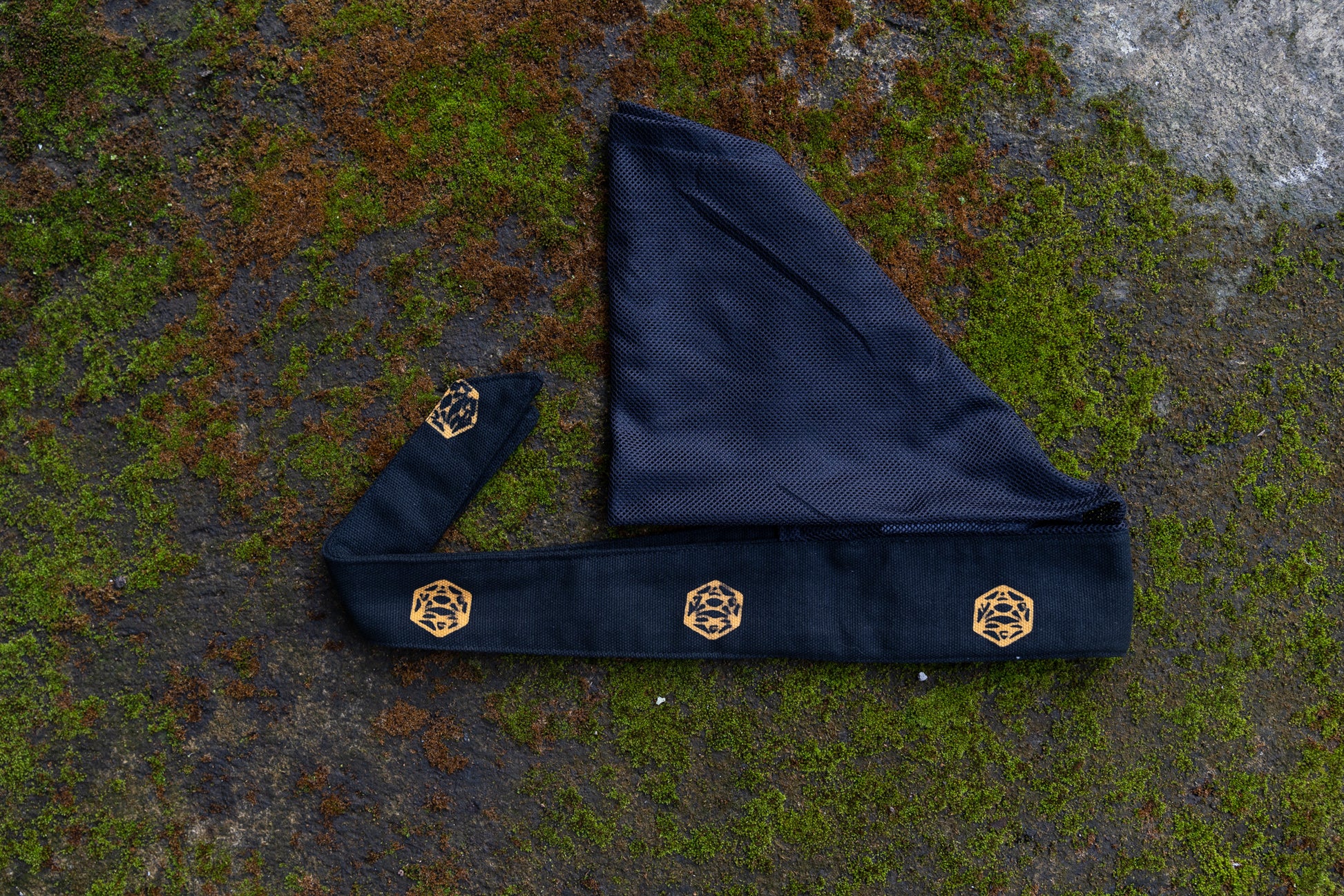 Pure black with the Dodecahedron stamp then hand painted gold. Black mesh head cover.