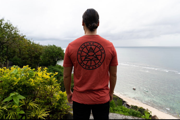 Natural dyes Mahogany and sappan wood to get this color. With a Merkaba on the front left peck and a Peaking Indo rising sun logo on the back.